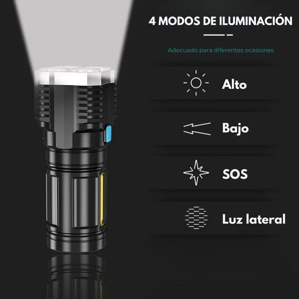 Con 4 modos de iluminación (Alto/Bajo/Estroboscópico/Luz lateral), esta linterna se adapta a todas tus necesidades. Úsala como una linterna frontal para caminar en la oscuridad o activa la luz lateral para iluminar tu espacio mientras lees.